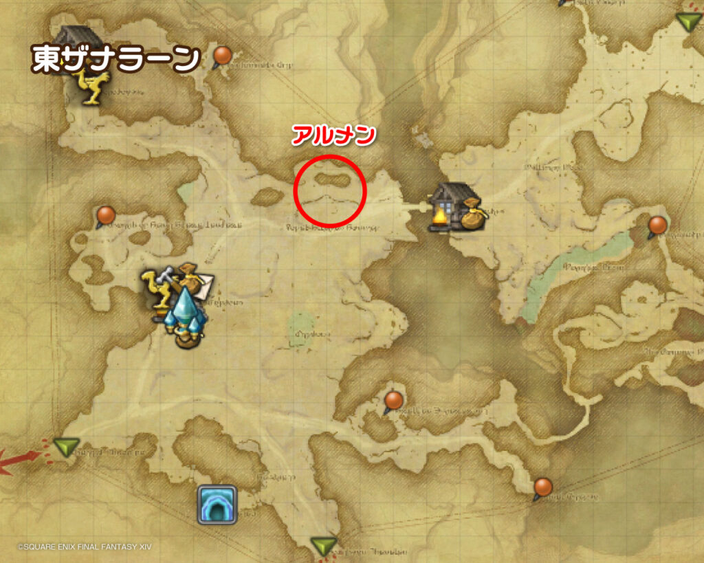 アルドゴートレザーのもう一つの素材「アルメン」も、同じ東ザナラーンで採掘師によって採集可能です。 周回ついでに採集しておくことで、素材集めの効率がさらにアップします。