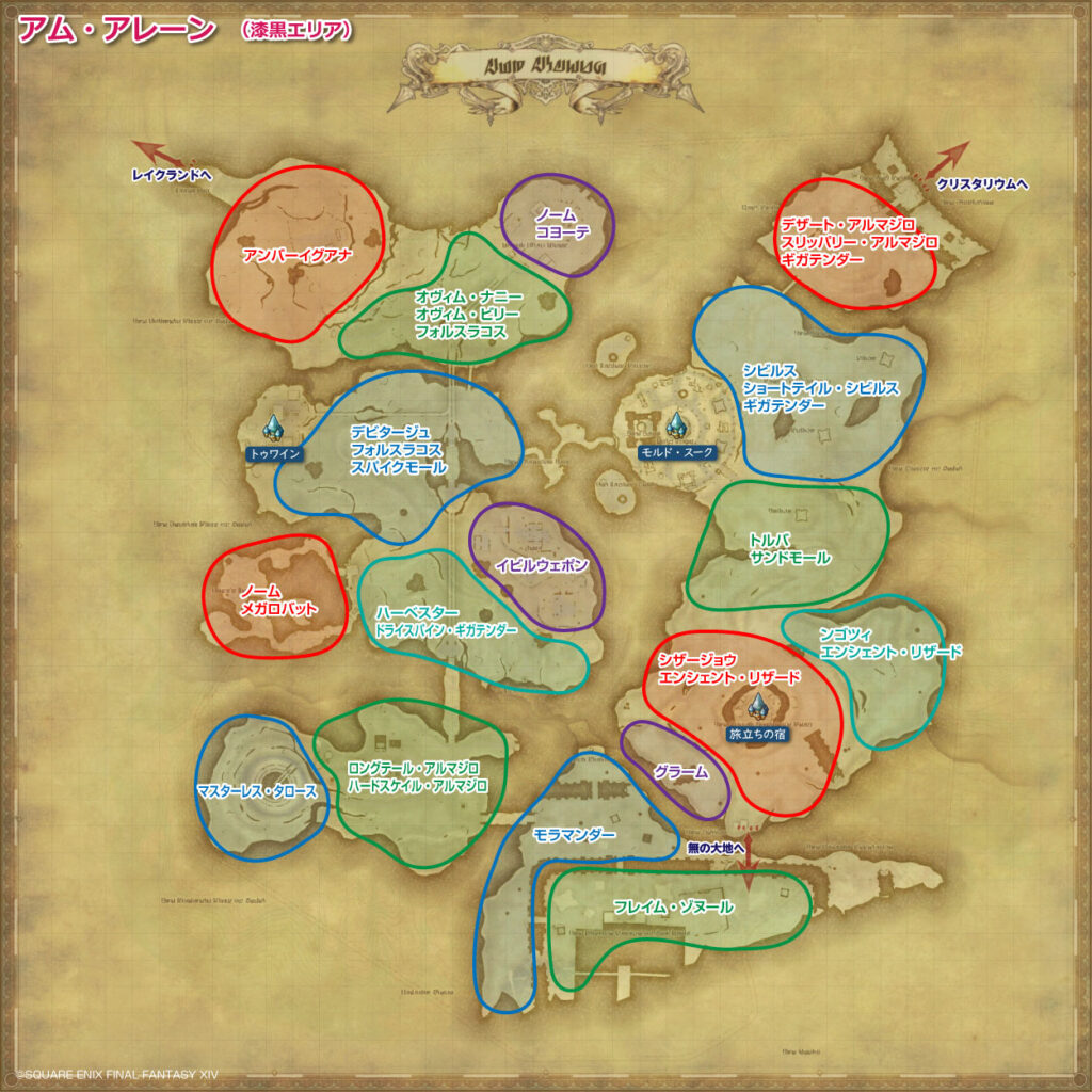 アム・アレーンに生息するモンスターの配置場所とドロップアイテムの一覧を掲載します。