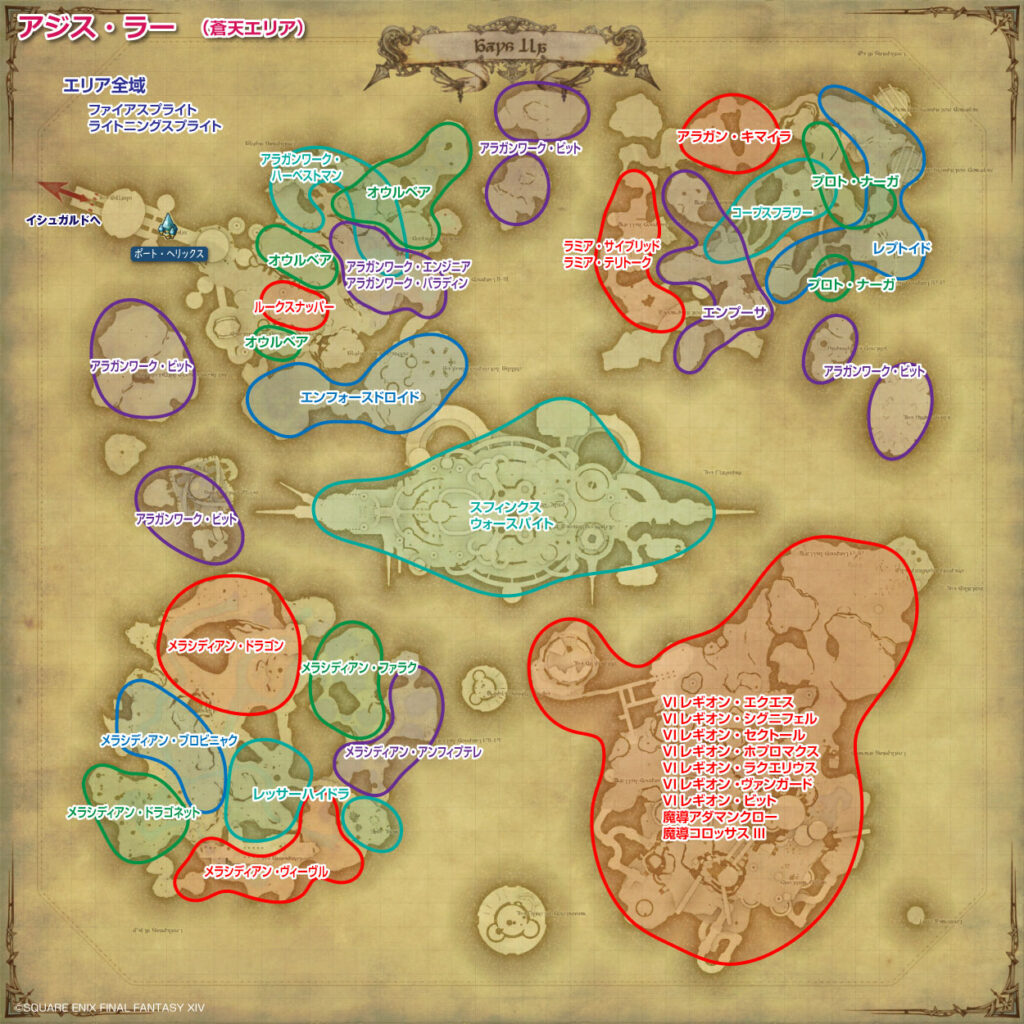 アジス・ラーに生息するモンスターの配置場所とドロップアイテムの一覧を掲載します。