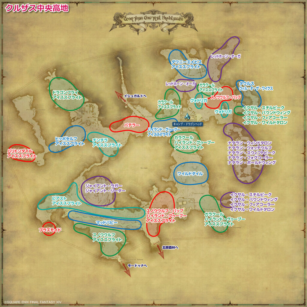クルザス中央高地に生息するモンスターの配置場所とドロップアイテムの一覧を掲載します。
