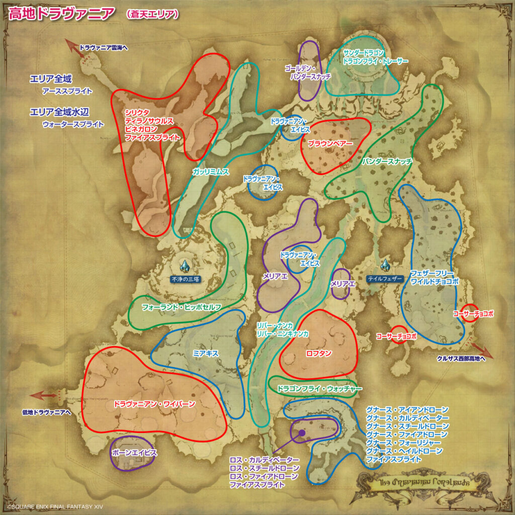 高地ドラヴァニアに生息するモンスターの配置場所とドロップアイテムの一覧を掲載します。