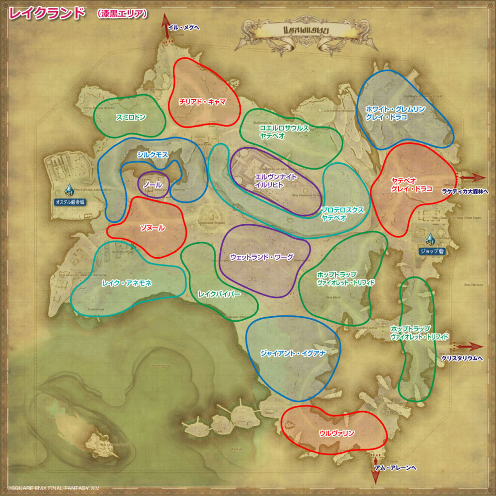 レイクランドに生息するモンスターの配置場所とドロップアイテムの一覧を掲載します。