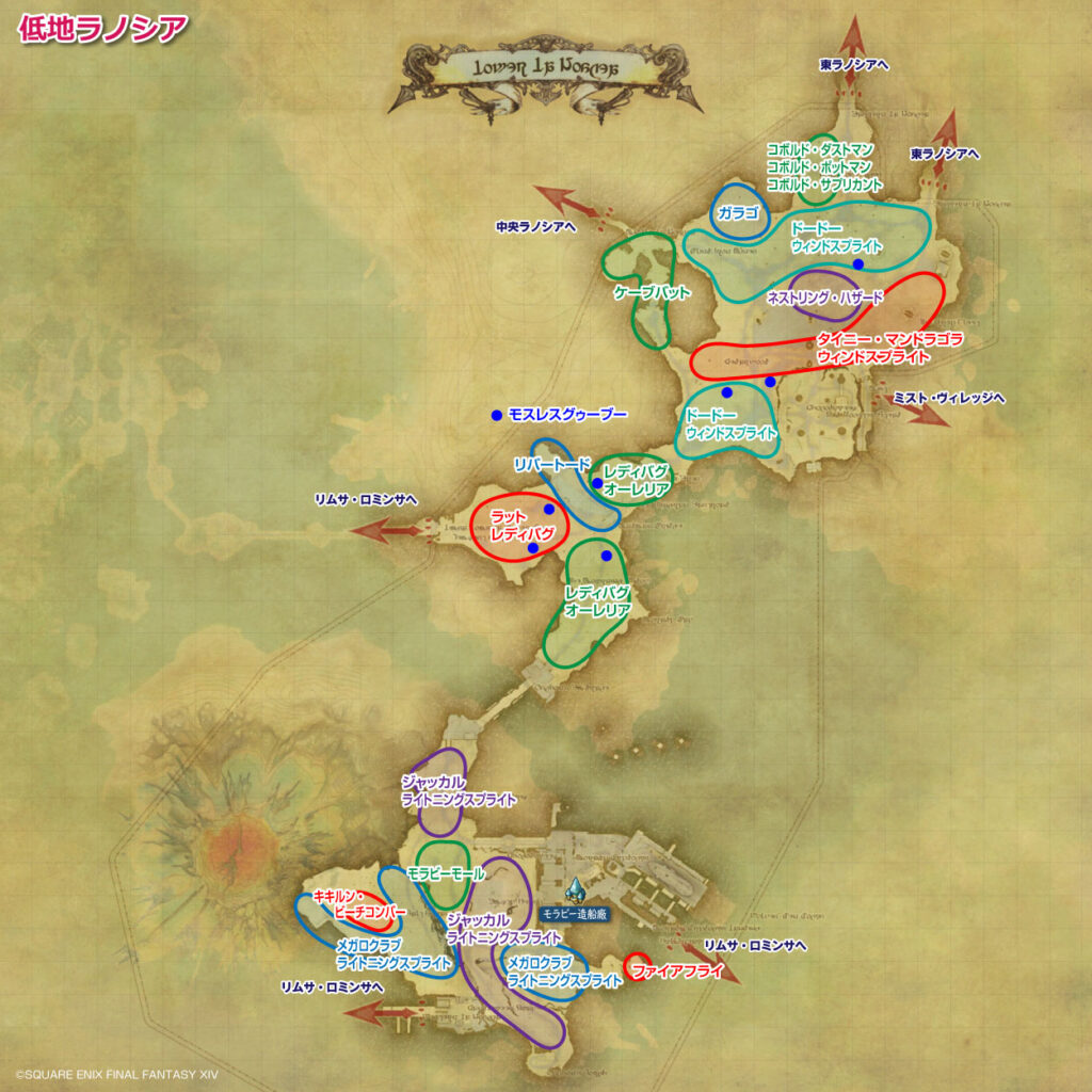 低地ラノシアに生息するモンスターの配置場所とドロップアイテムの一覧を掲載します。