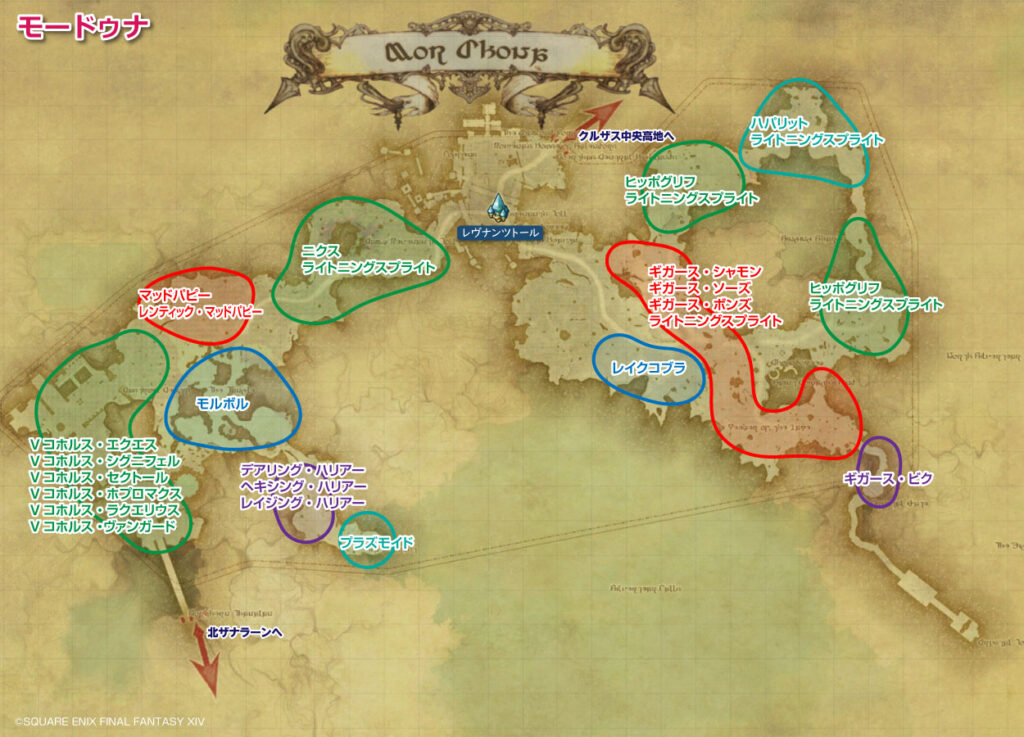 モードゥナに生息するモンスターの配置場所とドロップアイテムの一覧を掲載します。