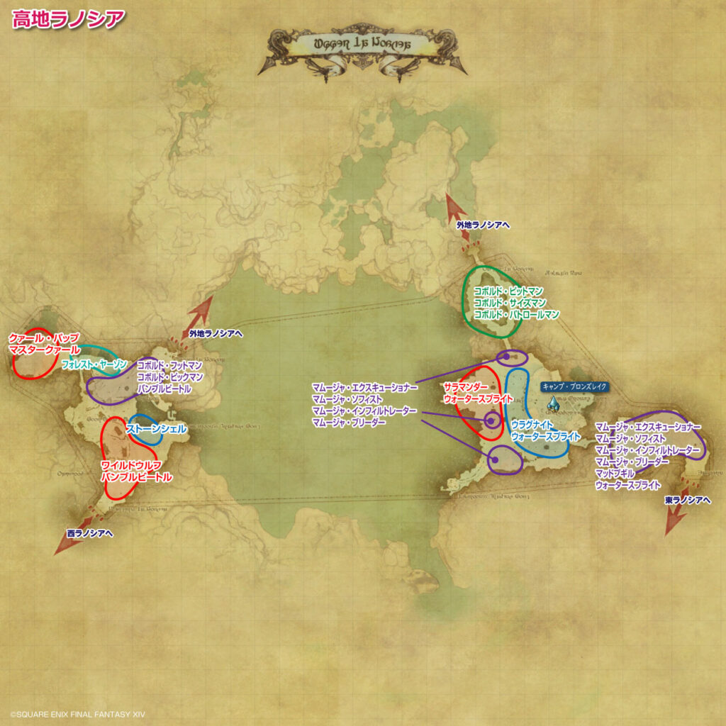 高地ラノシアに生息するモンスターの配置場所とドロップアイテムの一覧を掲載します。