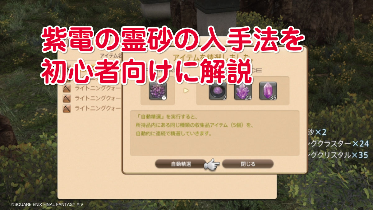 採掘師と園芸師での収集品採集から精選をおこなって紫電の霊砂を入手する流れを紹介します。